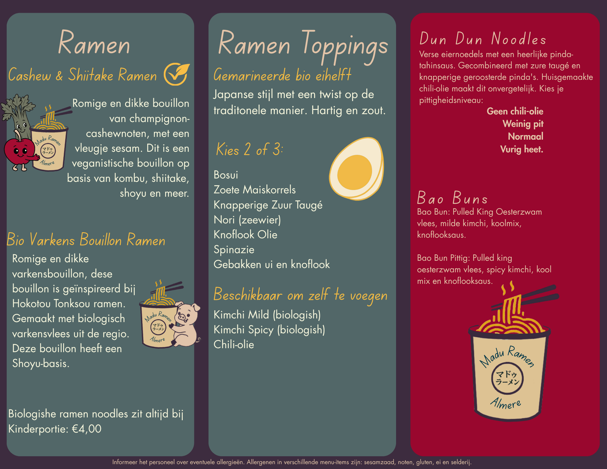 We serveren biologische Tonkotsu Ramen (varkens bottenbouillon) en Niban Dashi Ramen (vegan) met een basis van kombu, shiitake en cashewnoten. U stelt uw eigen maaltijd samen door uw favoriete topping te kiezen uit een ruime keuze.