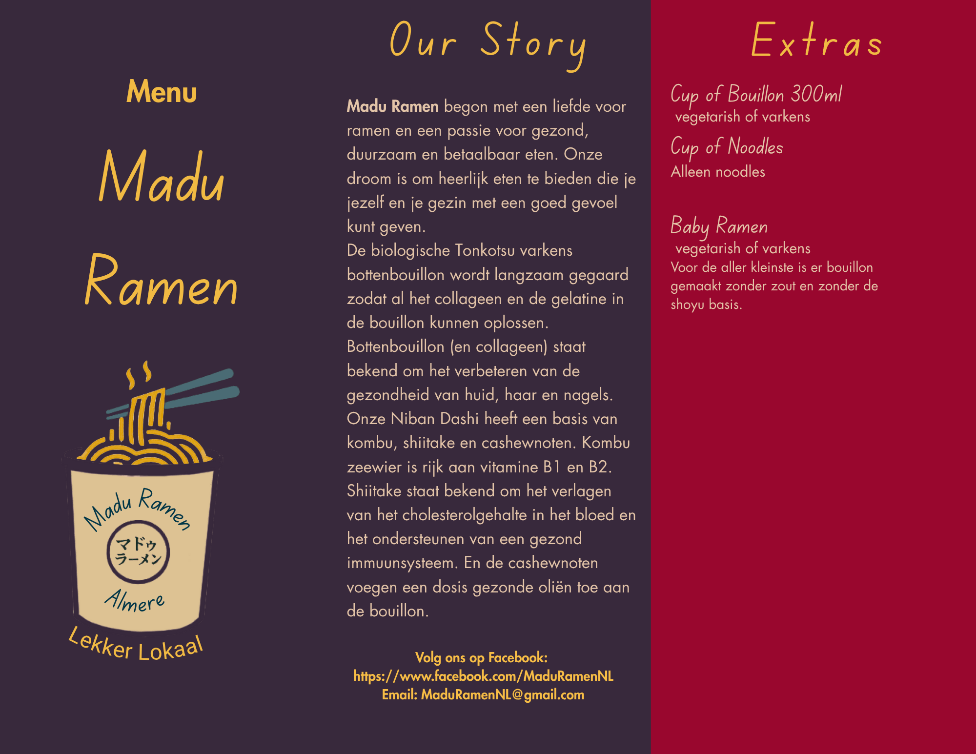 Madu Ramen begon met een liefde voor ramen en een passie voor gezond, duurzaam en betaalbaar eten. Onze droom is om heerlijk eten te bieden die je jezelf en je gezin met een goed gevoel kunt geven.