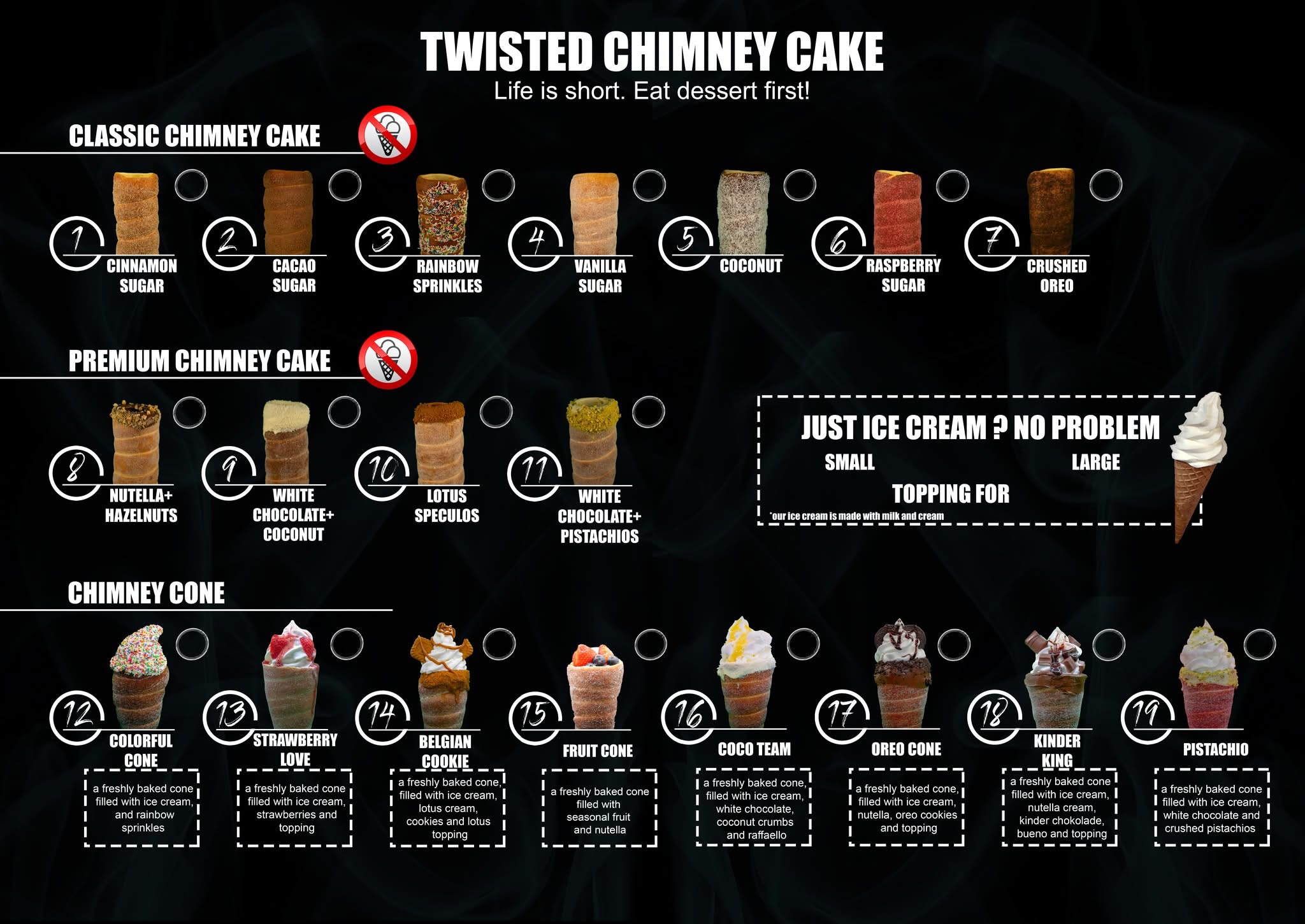 Onze absolute publieksfavoriet. De Chimney Cone wordt na het bakken licht afgekoeld, zodat onze natuurlijke ijssoorten perfect tot hun recht komen en niet te snel smelten. Vervolgens wordt hij gevuld met: