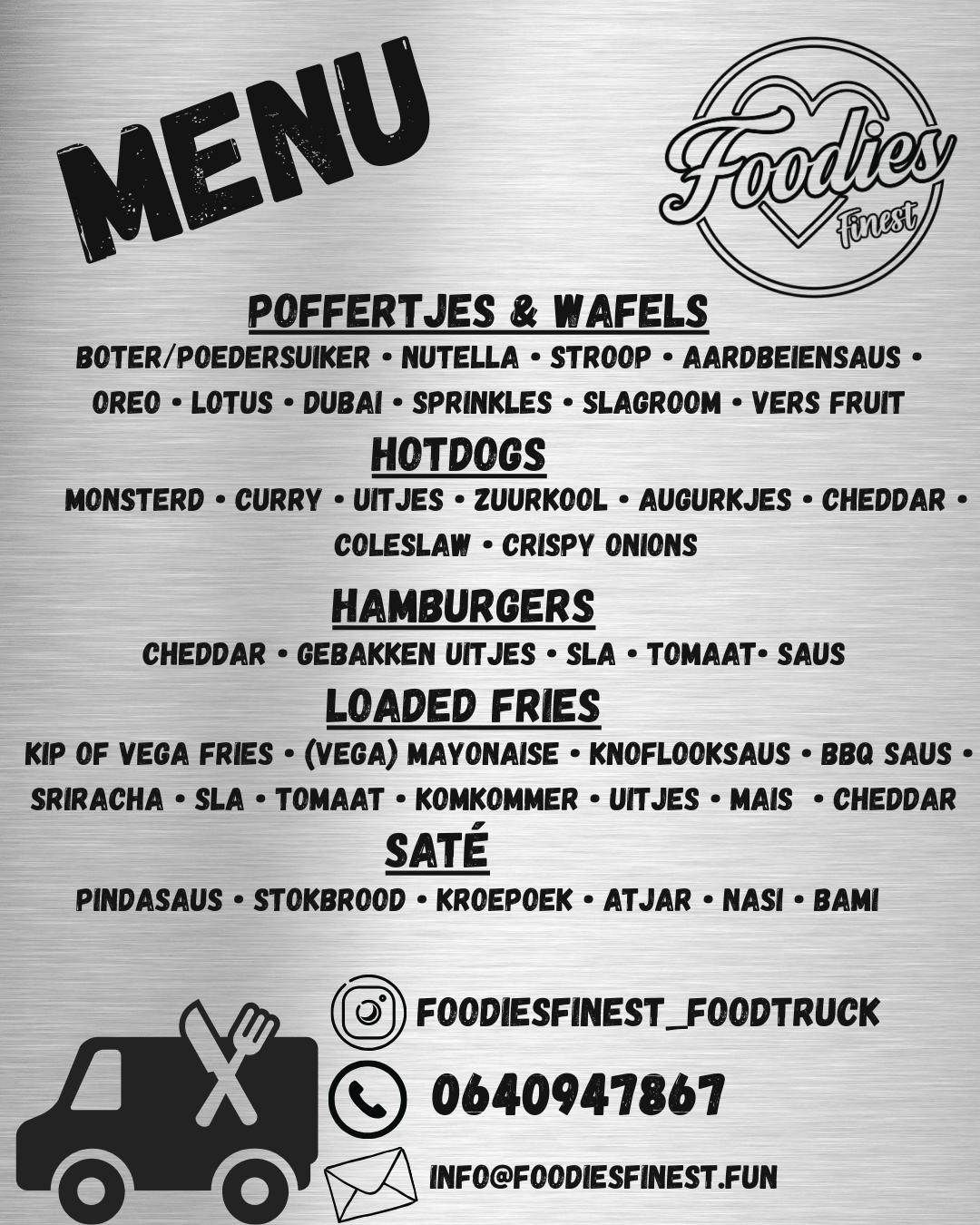 Foodies finest is mijn passie op wielen: comfort food met kwaliteit en een goede vibe. Ik run mijn truck met één doel: mensen blij maken met lekker eten, snelle service en oprechte gastvrijheid. We werken seizoensgericht en flexibel — van winterse braadworst tot publieksfavorieten zoals hotdogs, hamburgers, friet, saté en poffertjes. Herkenbaar, vers en altijd met aandacht gemaakt.