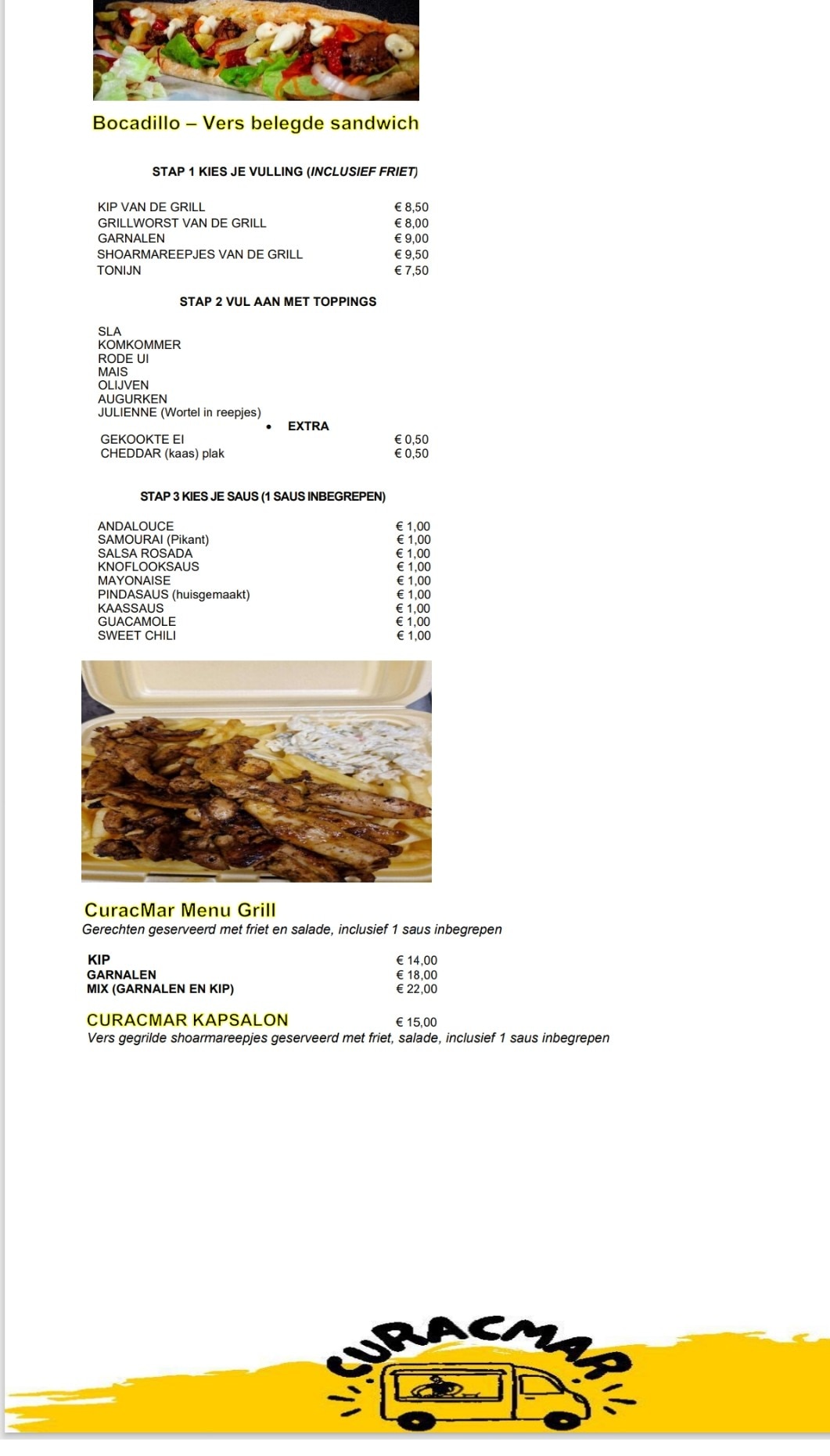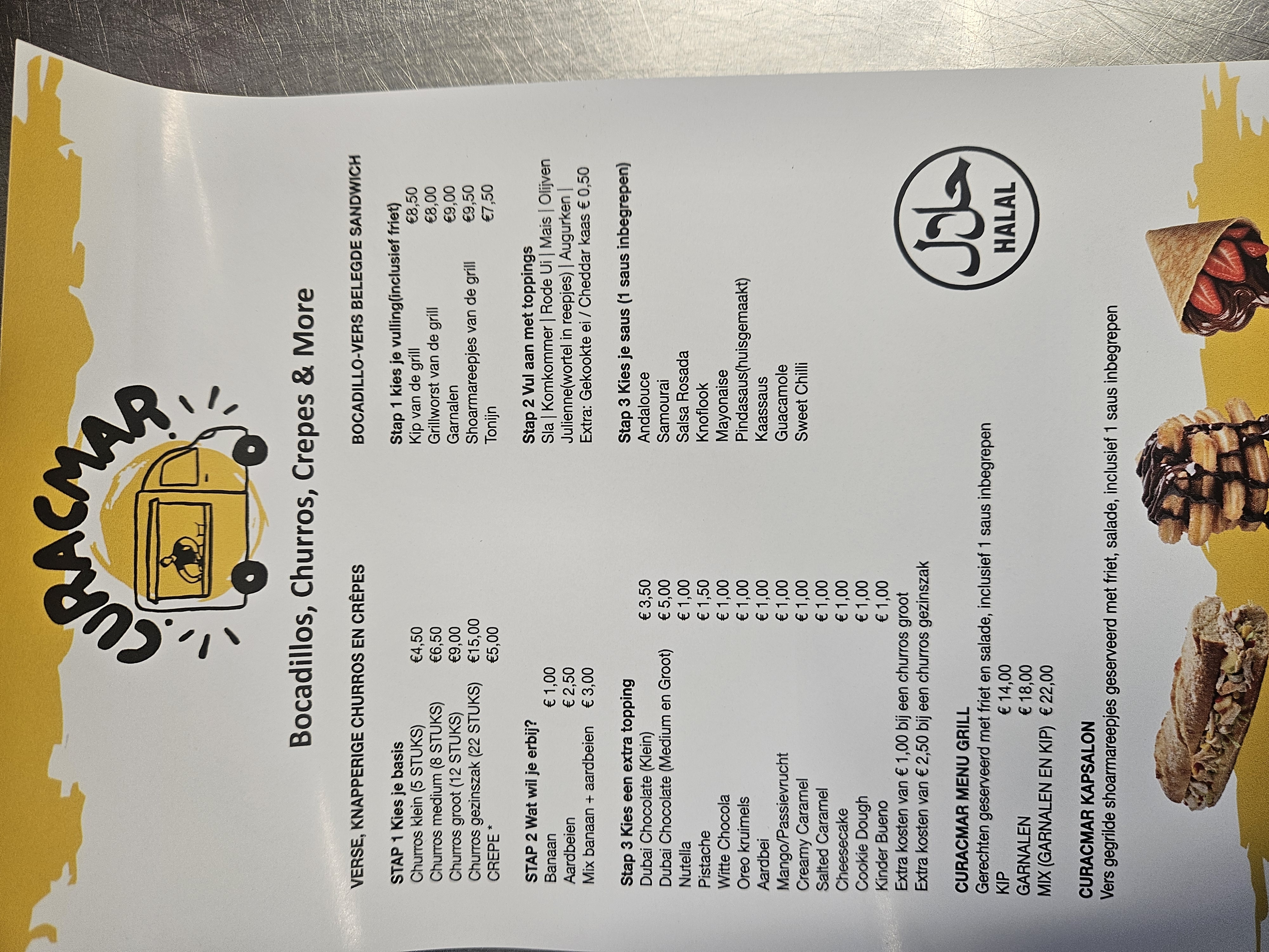 Welkom bij CURACMAR waar geurige malse vlees, vis, churros en crêpes, knapperige churros samenkomen in 1 smakelijk verhaal. Deze truck is ontstaan uit ons liefde voor streetfood uit Curacao en Marokko. Alles draait bij ons om persoonlijk contact. Ik leer mijn klanten graag kennen, maak een praatje en zorg dat iedereen zich welkom voelt. Die persoonlijke benadering maakt ons truck geen "snelle hap", maar een warme ervaring.