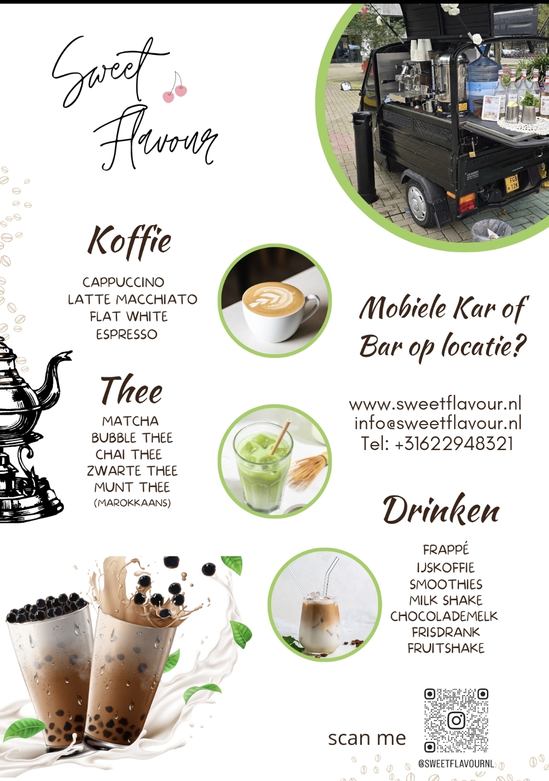 Ontmoet dan Sweet Flavour, onze charmante koffiekar! Wij zijn er speciaal voor al jouw zakelijke en maatschappelijke gelegenheden. Of het nu gaat om een bewonersbijeenkomst, een scholenevent of zakelijke- enof privé gelegenheid? Wij zorgen met onze koffieservice voor een warm welkom.