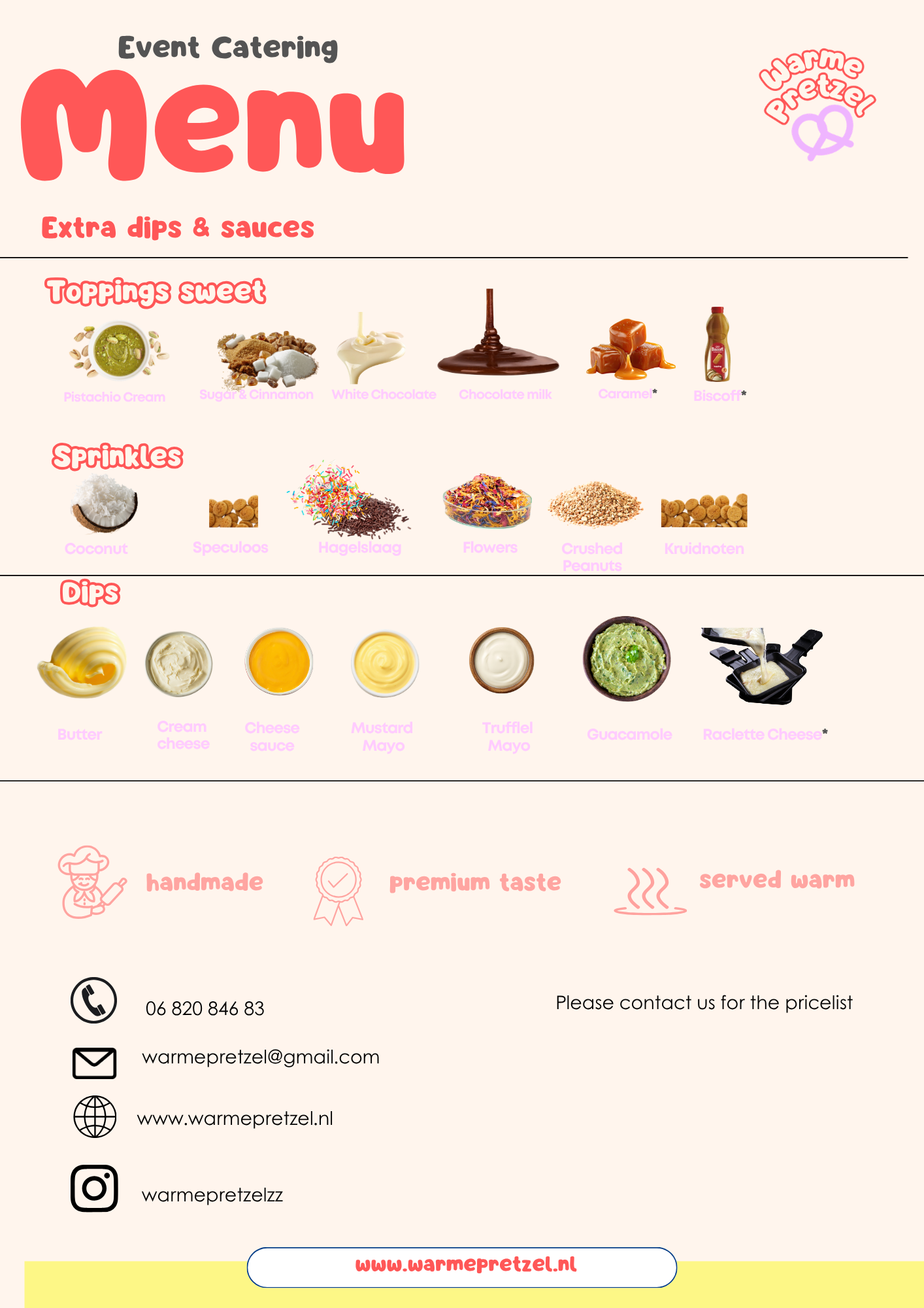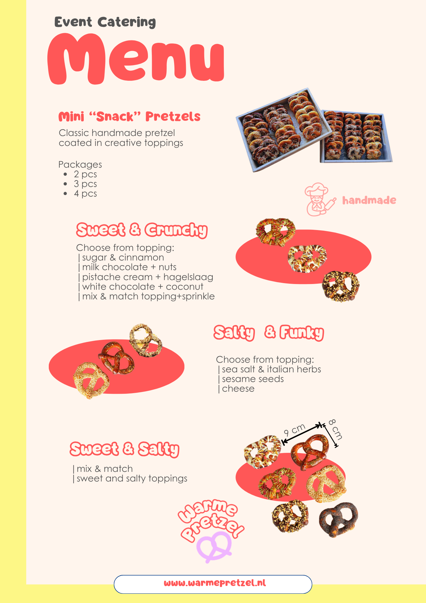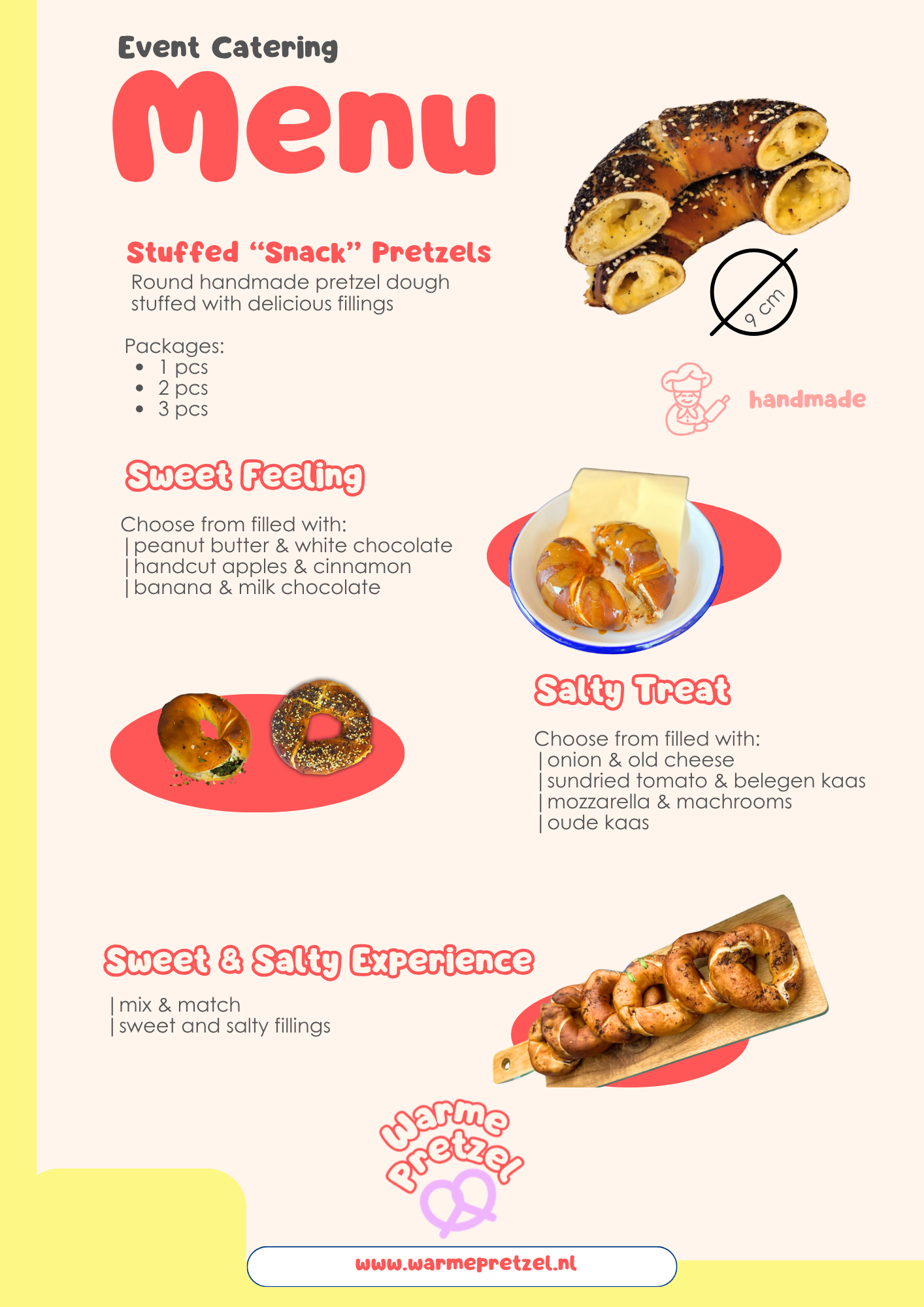 Looking for a unique culinary experience? WarmePretzel serves warm, handmade pretzels with high-quality ingredients and special sweet & salty toppings. Perfect as a meal or snack.Your guests will be full & satisfied.