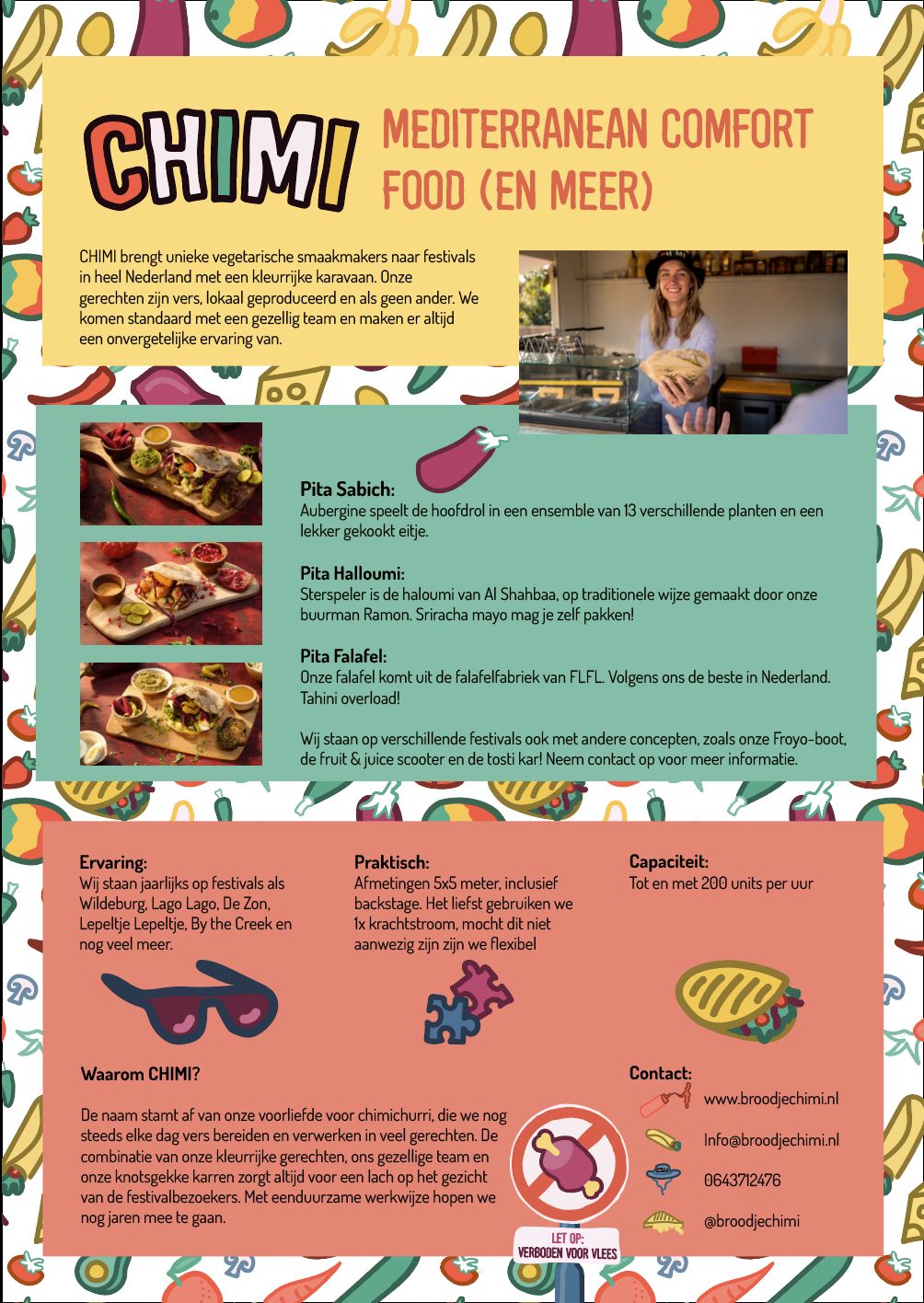 Onze gerechten zijn geinspireerd op mediterraans comfort-food. Denk aan warme pita's gevuld met knapperige en smeuige falafel, heerlijk zachte halloumi of kruidige sabich. Aangevuld met onze eigen chimichurri, tahini, allerlei soorten verse salades en spicy pepertjes. Voor iedereen die eens wat anders wil dan het standaardaanbod aan snackwagens.